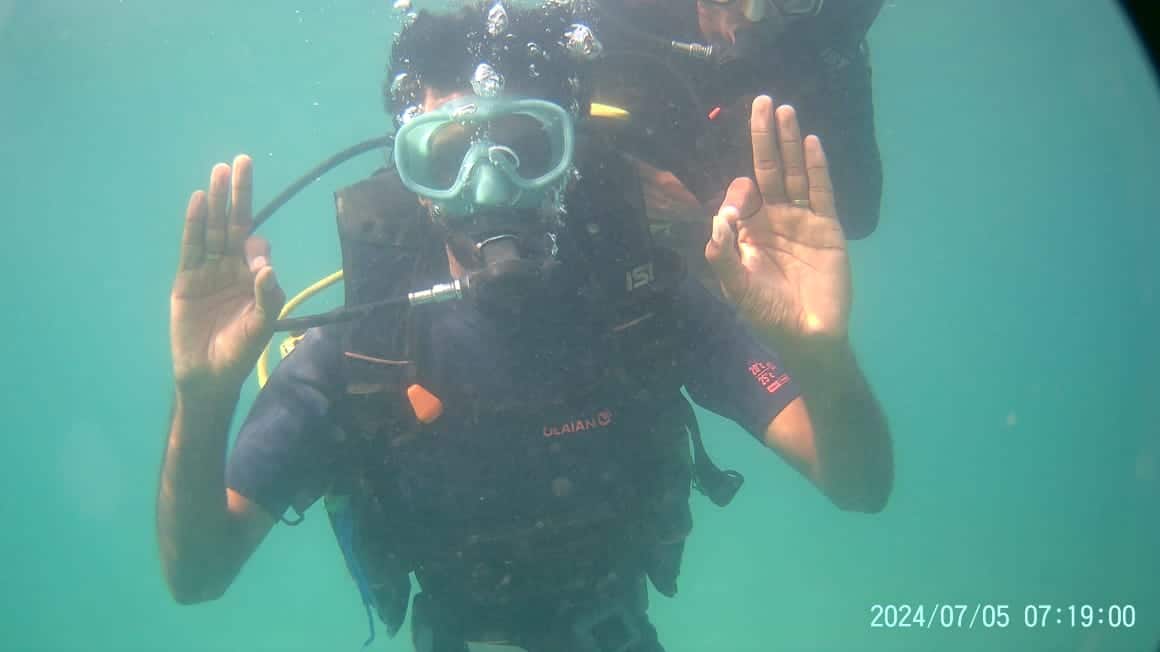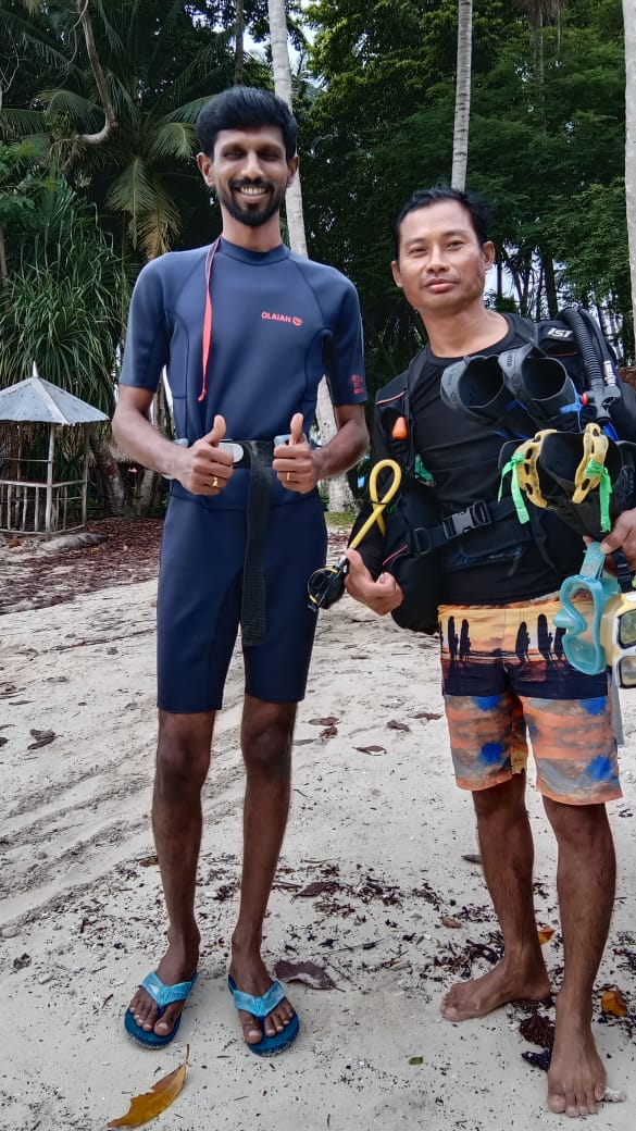 கற்று கொடுத்து உள்ளே கூட்டி கொண்டு போகிறவருடன் மனைவியோடு சேர்ந்து ஒரு selfie எடுத்து கொண்டு உள்ளே சென்று விட்டேன். அவர் கொல்கத்தாவை சேர்ந்தவர் என்று நினைக்கிறேன் (அங்கே பெரும்பாலனவர்கள் கொல்கத்தாவை சேர்ந்தவர்கள்). அவர் தொடர்ச்சியாக இரும்பி கொண்டே இருக்கிறார், ஆனால் தண்ணீரில் மூழ்கும் போது என்ன அசைவுகள் செய்ய வேண்டும் என்று சொல்லி கொடுத்து, பின்னாடி சிலிண்டர் வாயில் பைப், பைப்பை பல் இடுக்கில் அழுத்தி பிடித்து வாய் வழி மட்டுமே சுவாசம் செய்ய வேண்டும், மூக்கு முழுவதுமாக அடைக்க பட்டு இருக்கும்.